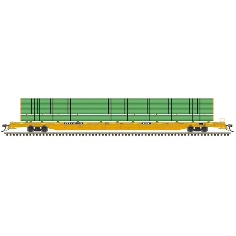 Atlas 50007702 Master Series N Scale F89J Flat Car - PTTX Yellow w/Conspicuity (w/ deck risers & green pipe load) Road # 602129 (Yellow)