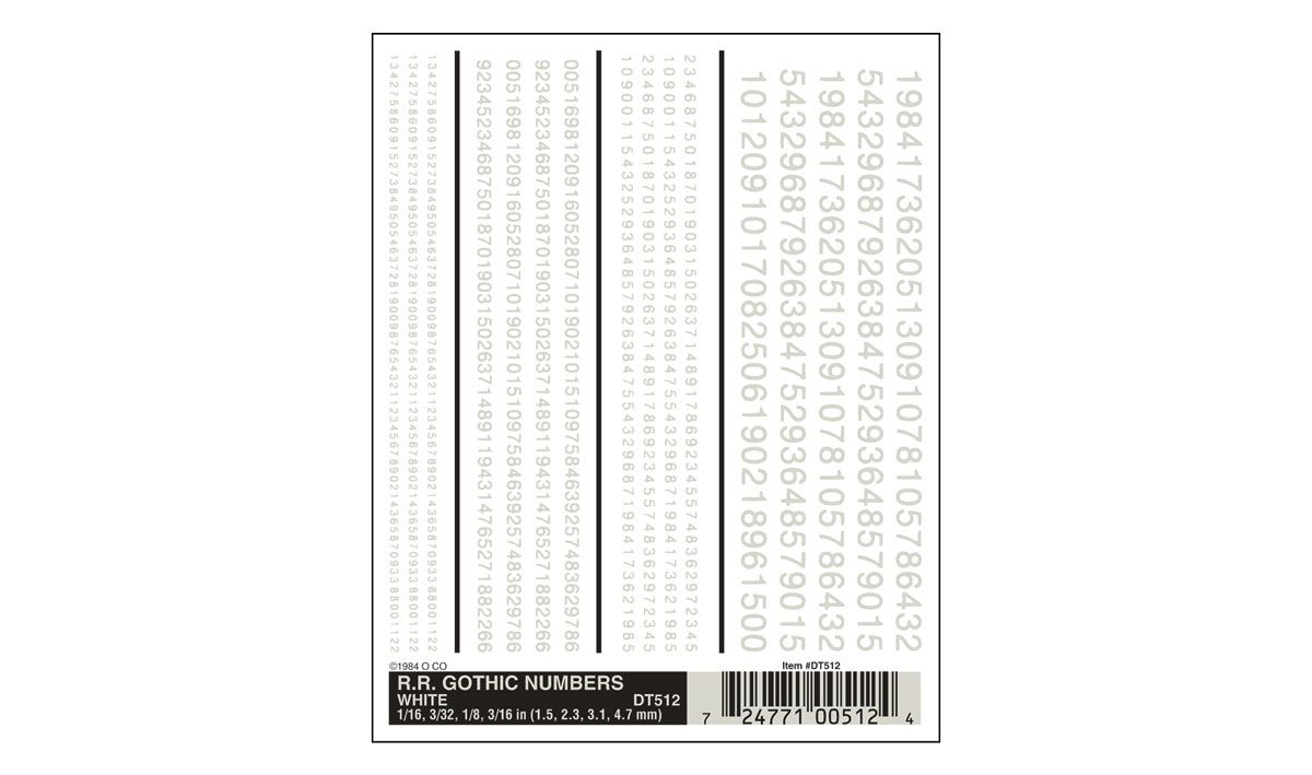 > Woodland Scenics 512 Dry Transfer Decals - RR Gothic Numbers White