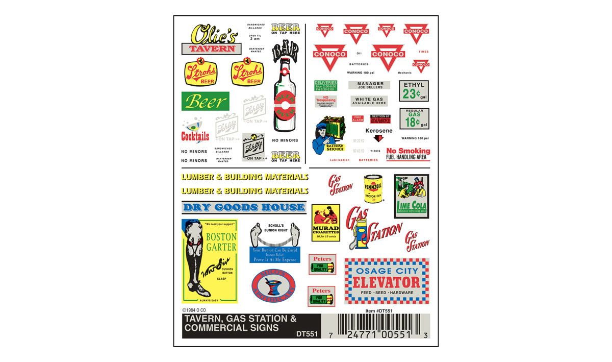 > Woodland Scenics 551 Dry Transfer Decals - Tavern, Gas Station and Commercial Signs