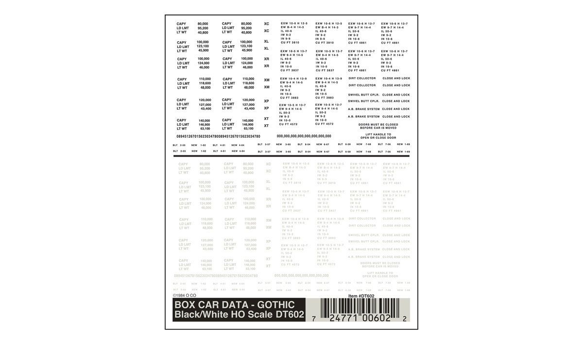 > Woodland Scenics 602 Dry Transfer Decals - Box Car Data Gothic Black/White HO Scale