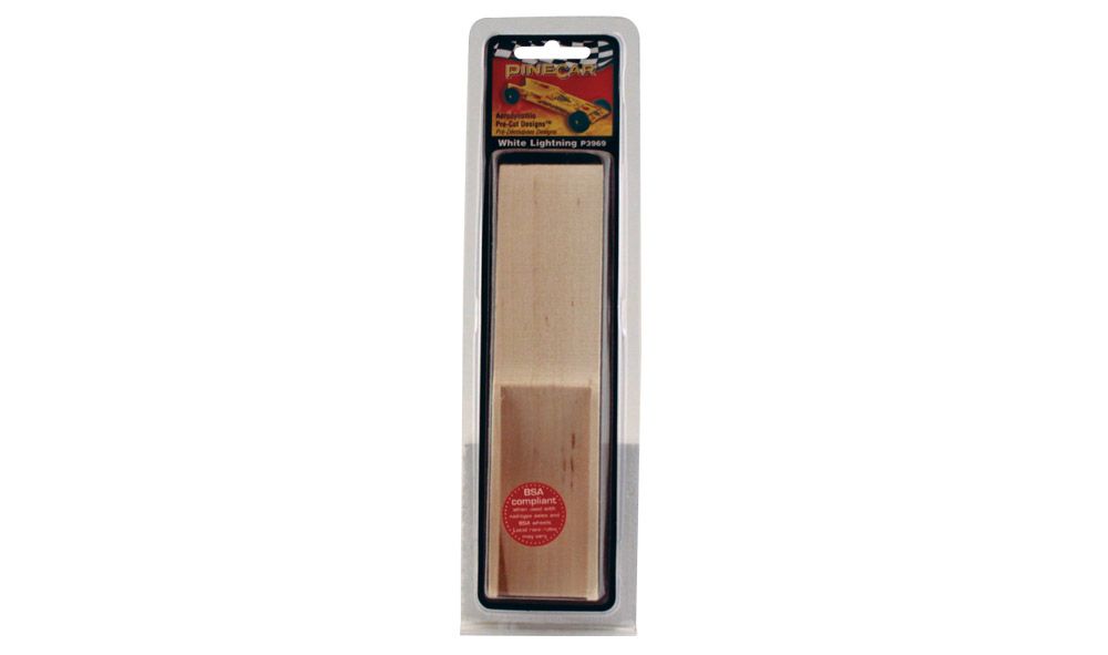 Low profile and aerodynamic, the White Lightning is geared toward speed. PineCar flat and plate weights fits in the cavity. There are extra grooves for optional extended wheel base. The White Lightning is a rough-cut and ready-to-finish block for those who want a great racing car but may not have the necessary tools or skills.