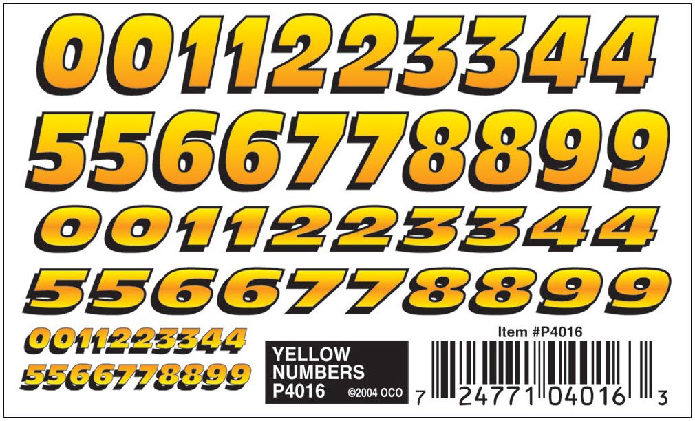 > PineCar 4016 Dry Transfer Decals - Yellow Numbers