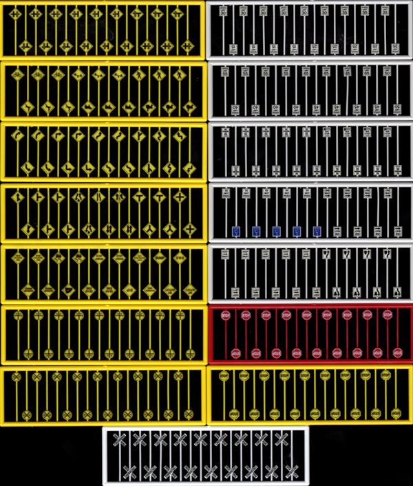 THIS PACKAGE CONTAINS 1 EACH OF ALL OF OUR INDIVIDUAL N SCALE ROAD SIGNS. IT CONTAINS 270 TOTAL SIGNS COVERING 74 DIFFERENT SIGNS. ALL SIGNS ARE INJECTION MOLDED IN APPROPRIATELY COLORED STYRENE AND PRINTED. THE $50 PRICE IS A 33% DISCOUNT COMPARED TO BUYING THE INDIVIDUAL PACKAGES.