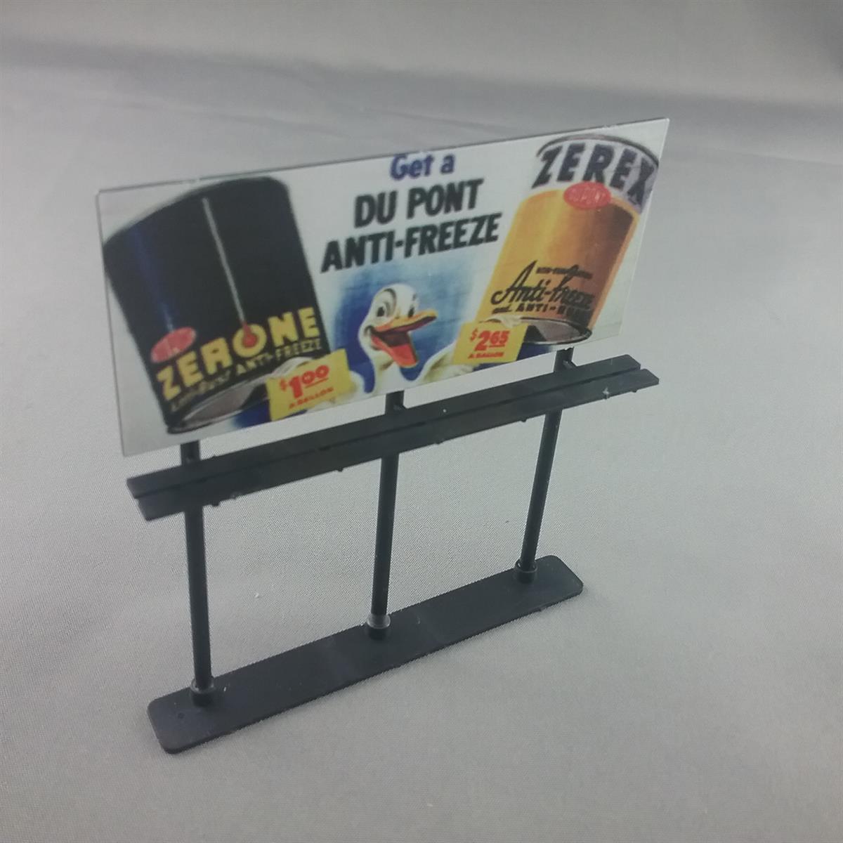 THESE BILLBOARDS ARE INJECTION MOLDED IN BLACK STYRENE WITH THE SIGN PRINTED DIRECTLY ON THE PLASTIC. THE ARTWORK WAS PREPARED FROM PHOTOGRAPHS OF THE ORIGINAL BILLBOARDS FROM THE 30'S, 40'S, 50'S & 60'S. ASSEMBLY TAKES LESS THAN 5 MINUTES. PART # OVERLAY DOES NOT APPEAR ON THE ACTUAL MODEL. THE SECOND PICTURE SHOWS AN ASSEMBLED BILLBOARD.