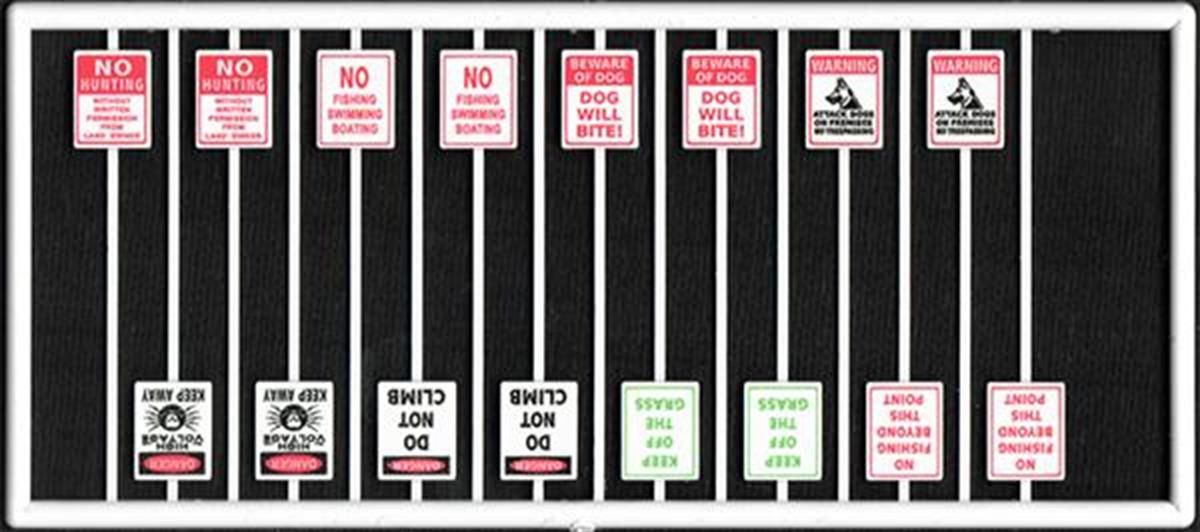 NO HUNTING, NO FISHING-SWIMMING-BOATING, BEWARE OF DOG, WARNING ATTACK DOGS, NO FISHING BEYOND THIS POINT, KEEP OFF THE GRASS, DO NOT CLIMB, HIGH VOLTAGE-KEEP AWAY